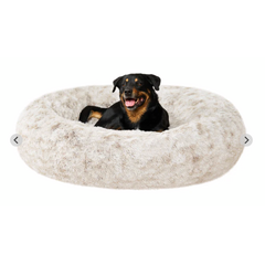 A safe, cozy space designed to help your dog relax and sleep better. This plush donut-style bed surrounds your dog in soft, long faux fur with raised bolstered edges that create a calming, nest-like environment — ideal for dogs who love to curl up, burrow, and feel secure....