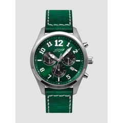 Name: The Vanguard in Leather Model: CHR-LTR-GRNBK 10 ATM, 6-hand Swiss chronograph with 4:00 date window, 30-minute register, Stainless steel case with hand stitched green leather strap, Green Two-tone sunray finish dial with diamond cut eyes, Luminous dial and hands, Sapphire crystal, Case diameter: 41 mm Case diameter: Gift Box, 1 year limited warranty.